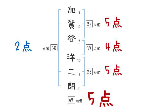 総運![]() | 加賀谷洋二朗さんの総運は47画の5つ星!実力が開花し発展する円満な人生。財に恵まれる。 あなたの人生を表す1番重要な運勢です。生涯を通じて影響する総合運となり、主に50歳以降の晩年期に影響を及ぼします。 |
