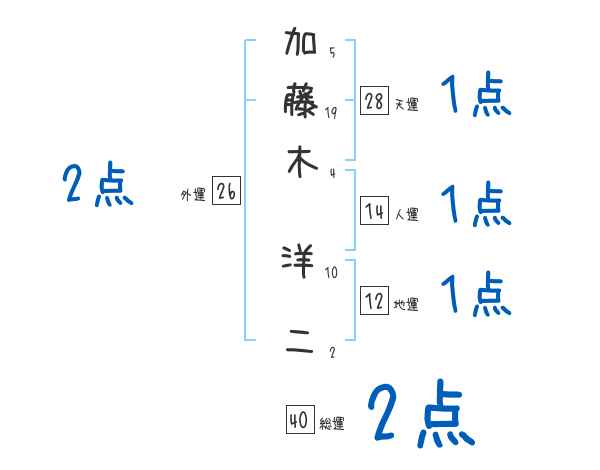 天運![]() | 加藤木洋二さんの天運は28画の1つ星!家庭環境に注意。スポーツで活躍できる能力があるかも。 家系が持つ宿命的な運勢を表します。祖先から受け継いだ苗字ですので自分の力が及びません。家柄を象徴します。 |