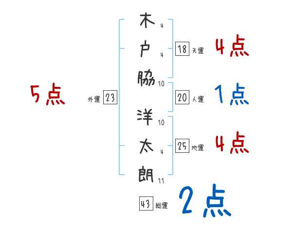 外運![]() | 木戸脇洋太朗さんの外運は23画の5つ星!想像力に優れ活力がある。一代で成功し名誉を手に入れる。 生活面を象徴する運勢です。外部から受ける影響力を表し、結婚運、家庭運や職場、環境への順応性を表します。 |