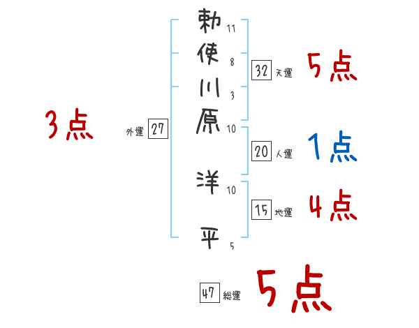 天運![]() | 勅使川原洋平さんの天運は32画の5つ星!柔軟性があり成功する。チャンスが多く金運が良い。 家系が持つ宿命的な運勢を表します。祖先から受け継いだ苗字ですので自分の力が及びません。家柄を象徴します。 |
