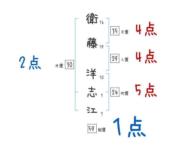 天運![]() | 衛藤洋志江さんの天運は35画の4つ星!温厚な性格で感受性が高い。穏和な性格で人望が厚い。 家系が持つ宿命的な運勢を表します。祖先から受け継いだ苗字ですので自分の力が及びません。家柄を象徴します。 |