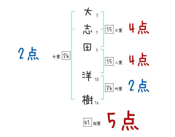 外運![]() | 大志田洋樹さんの外運は26画の2つ星!波瀾万丈かも。信頼できる人を大事にしましょう。 生活面を象徴する運勢です。外部から受ける影響力を表し、結婚運、家庭運や職場、環境への順応性を表します。 |