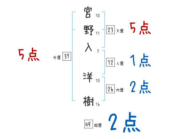 外運![]() | 宮野入洋樹さんの外運は37画の5つ星!努力家で順応性に優れる。現実的な考え方ができ忠実に物事をこなす。 生活面を象徴する運勢です。外部から受ける影響力を表し、結婚運、家庭運や職場、環境への順応性を表します。 |