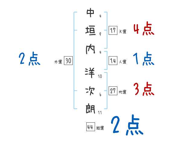 総運![]() | 中垣内洋次朗さんの総運は44画の2つ星!誠実で慎重な性格。物事を考えすぎないように注意しましょう。 あなたの人生を表す1番重要な運勢です。生涯を通じて影響する総合運となり、主に50歳以降の晩年期に影響を及ぼします。 |