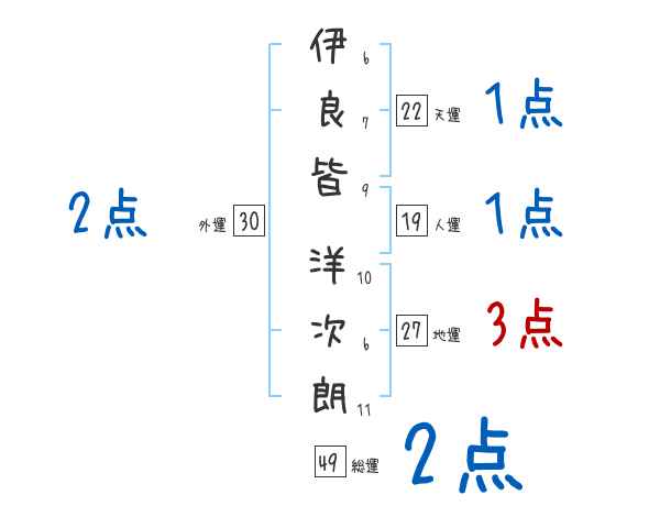 地運![]() | 伊良皆洋次朗さんの地運は27画の3つ星!頭脳明晰だが強情で摩擦が多い傾向。孤立に注意。 個性を表す基礎的な運勢です。性格形成や対人関係、行動力など家庭環境に影響されます。主に誕生してから20歳くらいまでの若年期の運勢を表します。 |