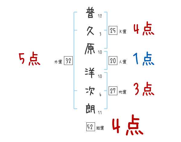 外運![]() | 普久原洋次朗さんの外運は32画の5つ星!柔軟性があり成功する。チャンスが多く金運が良い。 生活面を象徴する運勢です。外部から受ける影響力を表し、結婚運、家庭運や職場、環境への順応性を表します。 |