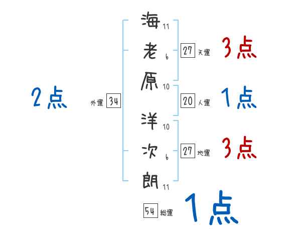 天運![]() | 海老原洋次朗さんの天運は27画の3つ星!頭脳明晰だが強情で摩擦が多い傾向。孤立に注意。 家系が持つ宿命的な運勢を表します。祖先から受け継いだ苗字ですので自分の力が及びません。家柄を象徴します。 |