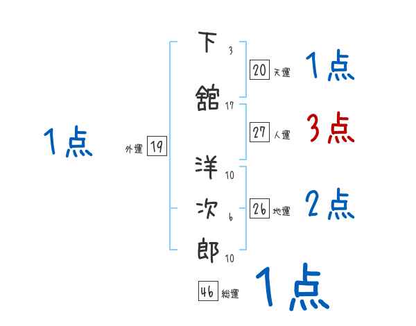 地運![]() | 下舘洋次郎さんの地運は26画の2つ星!波瀾万丈かも。信頼できる人を大事にしましょう。 個性を表す基礎的な運勢です。性格形成や対人関係、行動力など家庭環境に影響されます。主に誕生してから20歳くらいまでの若年期の運勢を表します。 |