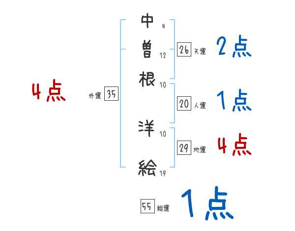 外運![]() | 中曽根洋絵さんの外運は35画の4つ星!温厚な性格で感受性が高い。穏和な性格で人望が厚い。 生活面を象徴する運勢です。外部から受ける影響力を表し、結婚運、家庭運や職場、環境への順応性を表します。 |