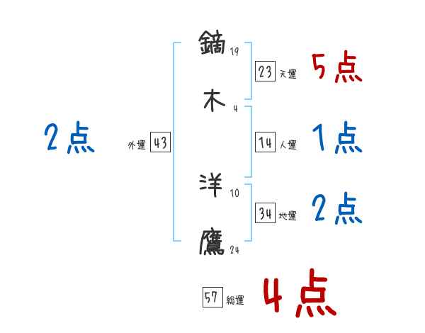 天運![]() | 鏑木洋鷹さんの天運は23画の5つ星!想像力に優れ活力がある。一代で成功し名誉を手に入れる。 家系が持つ宿命的な運勢を表します。祖先から受け継いだ苗字ですので自分の力が及びません。家柄を象徴します。 |