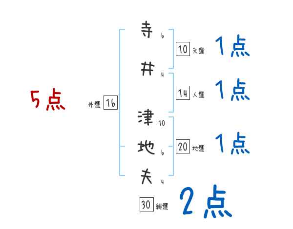 外運![]() | 寺井津地夫さんの外運は16画の5つ星!人望が厚く大きく発展する。逆転成功が見える。 生活面を象徴する運勢です。外部から受ける影響力を表し、結婚運、家庭運や職場、環境への順応性を表します。 |