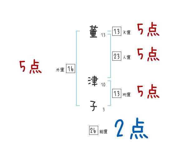 天運![]() | 董津子さんの天運は13画の5つ星!才能に恵まれ人気がある。名声を手に入れる。円満な人生。 家系が持つ宿命的な運勢を表します。祖先から受け継いだ苗字ですので自分の力が及びません。家柄を象徴します。 |