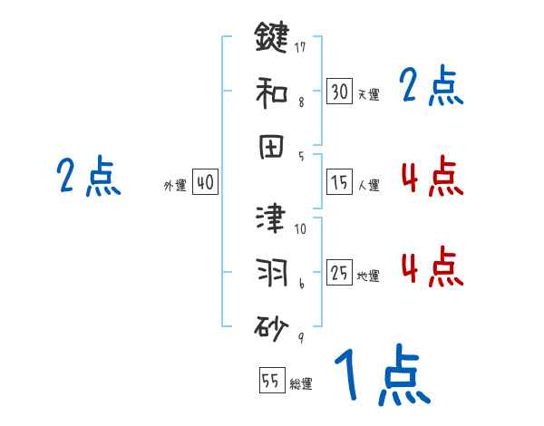 天運![]() | 鍵和田津羽砂さんの天運は30画の2つ星!浮き沈みの激しさに注意しましょう。 家系が持つ宿命的な運勢を表します。祖先から受け継いだ苗字ですので自分の力が及びません。家柄を象徴します。 |