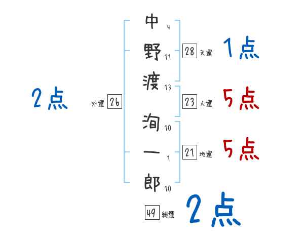 天運![]() | 中野渡洵一郎さんの天運は28画の1つ星!家庭環境に注意。スポーツで活躍できる能力があるかも。 家系が持つ宿命的な運勢を表します。祖先から受け継いだ苗字ですので自分の力が及びません。家柄を象徴します。 |