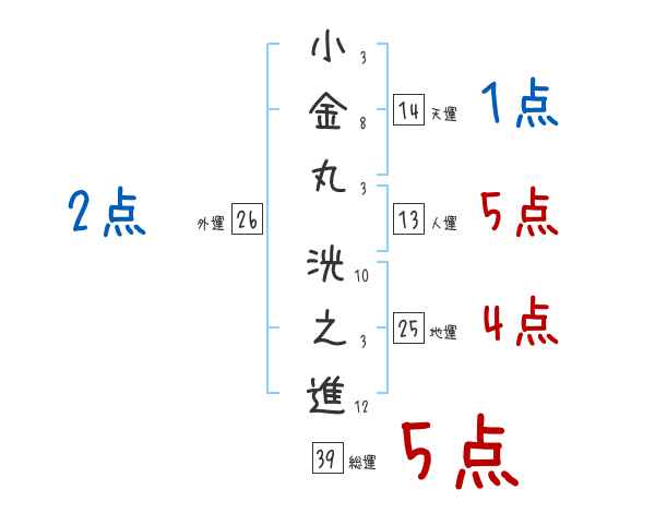 総運![]() | 小金丸洸之進さんの総運は39画の5つ星!社交性に優れ人望が厚い。人の上に立ち成功する。 あなたの人生を表す1番重要な運勢です。生涯を通じて影響する総合運となり、主に50歳以降の晩年期に影響を及ぼします。 |