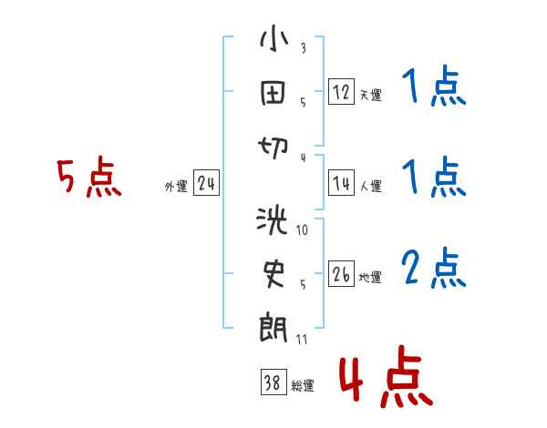 | 外運  | 小田切洸史朗さんの外運は24画の5つ星!家庭運が良く順調な人生。金運にも恵まれる。生活面を象徴する運勢です。外部から受ける影響力を表し、結婚運、家庭運や職場、環境への順応性を表します。 |
