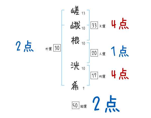 天運![]() | 嵯峨根洸希さんの天運は33画の4つ星!権力志向でプライドが高い。勇気があり運を切り開き成功する。 家系が持つ宿命的な運勢を表します。祖先から受け継いだ苗字ですので自分の力が及びません。家柄を象徴します。 |
