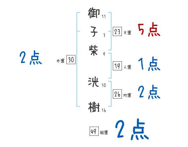 天運![]() | 御子柴洸樹さんの天運は23画の5つ星!想像力に優れ活力がある。一代で成功し名誉を手に入れる。 家系が持つ宿命的な運勢を表します。祖先から受け継いだ苗字ですので自分の力が及びません。家柄を象徴します。 |