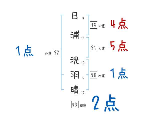 外運![]() | 日浦洸羽晴さんの外運は22画の1つ星!努力することが苦手ないっぽう手先が器用。芸術性にも優れる。 生活面を象徴する運勢です。外部から受ける影響力を表し、結婚運、家庭運や職場、環境への順応性を表します。 |