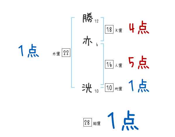 総運![]() | 勝亦洸さんの総運は28画の1つ星!家庭環境に注意。スポーツで活躍できる能力があるかも。 あなたの人生を表す1番重要な運勢です。生涯を通じて影響する総合運となり、主に50歳以降の晩年期に影響を及ぼします。 |