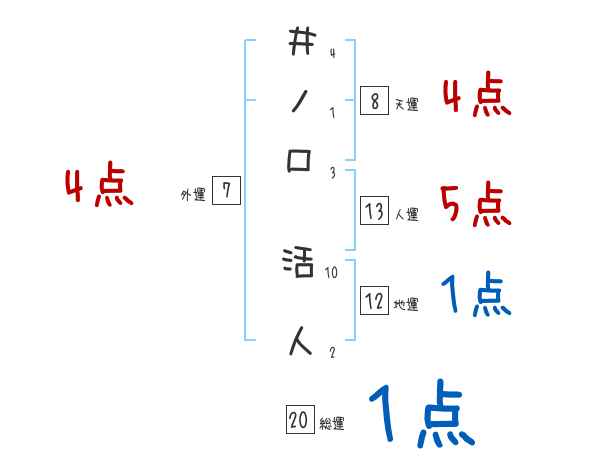人運![]() | 井ノ口活人さんの人運は13画の5つ星!才能に恵まれ人気がある。名声を手に入れる。円満な人生。 性格や才能などを表す2番目に重要な運勢です。人間関係や協調性、社会的な成功に影響します。主に20歳から50歳ぐらいまでの中年期の運勢を表します。 |