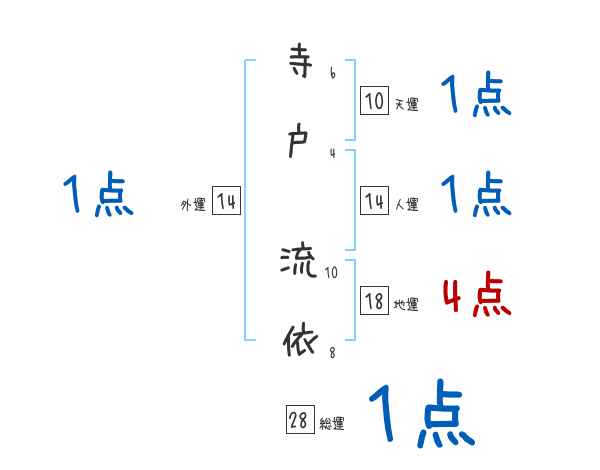 天運![]() | 寺戸流依さんの天運は10画の1つ星!不安を感じやすい傾向。ストレスを抱えないように注意しましょう。 家系が持つ宿命的な運勢を表します。祖先から受け継いだ苗字ですので自分の力が及びません。家柄を象徴します。 |