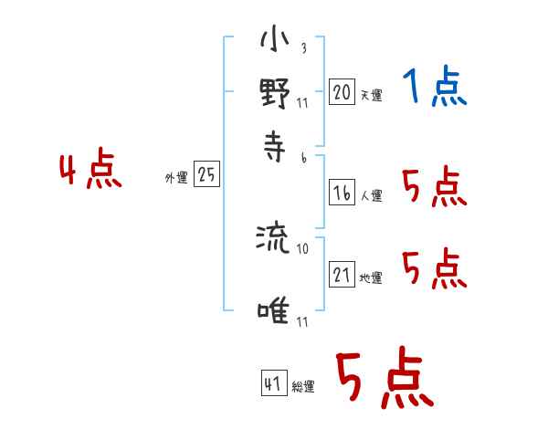 人運![]() | 小野寺流唯さんの人運は16画の5つ星!人望が厚く大きく発展する。逆転成功が見える。 性格や才能などを表す2番目に重要な運勢です。人間関係や協調性、社会的な成功に影響します。主に20歳から50歳ぐらいまでの中年期の運勢を表します。 |