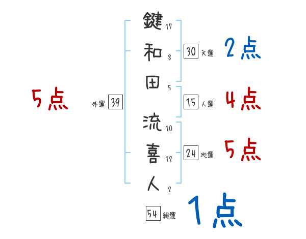 外運![]() | 鍵和田流喜人さんの外運は39画の5つ星!社交性に優れ人望が厚い。人の上に立ち成功する。 生活面を象徴する運勢です。外部から受ける影響力を表し、結婚運、家庭運や職場、環境への順応性を表します。 |