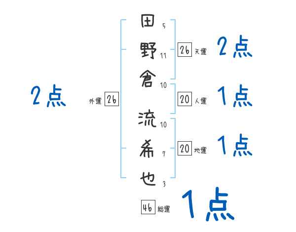 天運![]() | 田野倉流希也さんの天運は26画の2つ星!波瀾万丈かも。信頼できる人を大事にしましょう。 家系が持つ宿命的な運勢を表します。祖先から受け継いだ苗字ですので自分の力が及びません。家柄を象徴します。 |