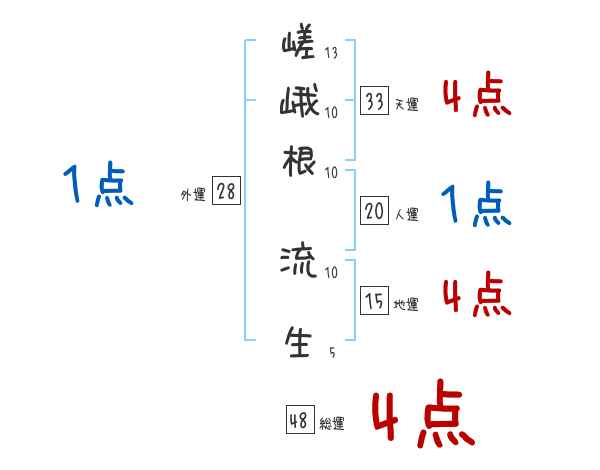 天運![]() | 嵯峨根流生さんの天運は33画の4つ星!権力志向でプライドが高い。勇気があり運を切り開き成功する。 家系が持つ宿命的な運勢を表します。祖先から受け継いだ苗字ですので自分の力が及びません。家柄を象徴します。 |