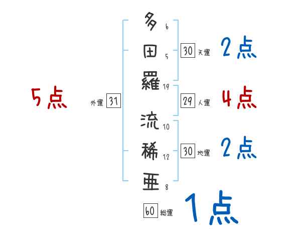 天運![]() | 多田羅流稀亜さんの天運は30画の2つ星!浮き沈みの激しさに注意しましょう。 家系が持つ宿命的な運勢を表します。祖先から受け継いだ苗字ですので自分の力が及びません。家柄を象徴します。 |