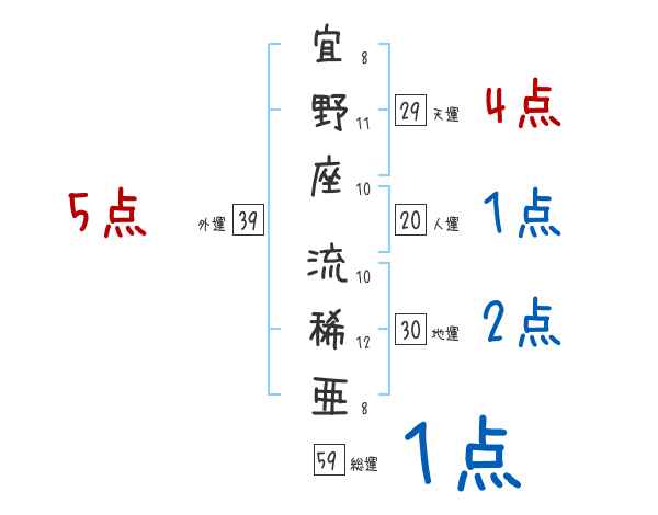 総運![]() | 宜野座流稀亜さんの総運は59画の1つ星!意志の弱さであきらめることが多いかも。粘り強さが必要。 あなたの人生を表す1番重要な運勢です。生涯を通じて影響する総合運となり、主に50歳以降の晩年期に影響を及ぼします。 |