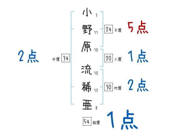 天運![]() | 小野原流稀亜さんの天運は24画の5つ星!家庭運が良く順調な人生。金運にも恵まれる。 家系が持つ宿命的な運勢を表します。祖先から受け継いだ苗字ですので自分の力が及びません。家柄を象徴します。 |