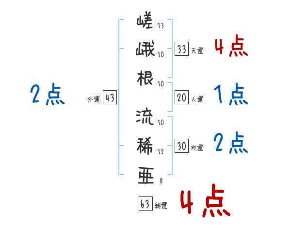 嵯峨根流稀亜さんの総運は63画の4つ星