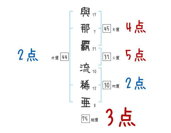 天運![]() | 與那覇流稀亜さんの天運は45画の4つ星!もくもくと物事を進め達成する。地味な努力家。 家系が持つ宿命的な運勢を表します。祖先から受け継いだ苗字ですので自分の力が及びません。家柄を象徴します。 |