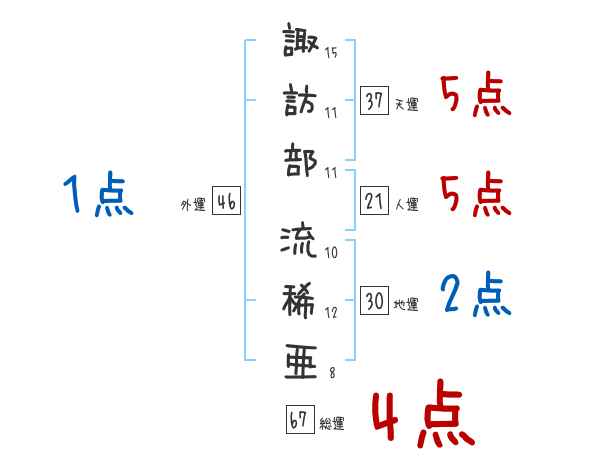 天運![]() | 諏訪部流稀亜さんの天運は37画の5つ星!努力家で順応性に優れる。現実的な考え方ができ忠実に物事をこなす。 家系が持つ宿命的な運勢を表します。祖先から受け継いだ苗字ですので自分の力が及びません。家柄を象徴します。 |