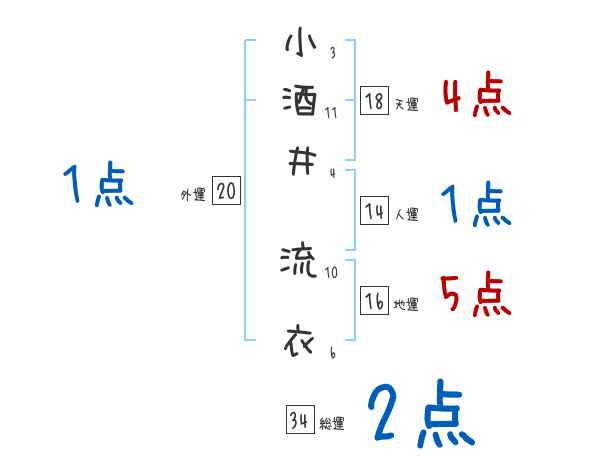総運![]() | 小酒井流衣さんの総運は34画の2つ星!独創性に優れるが、自尊心が強く災難に注意しましょう。 あなたの人生を表す1番重要な運勢です。生涯を通じて影響する総合運となり、主に50歳以降の晩年期に影響を及ぼします。 |
