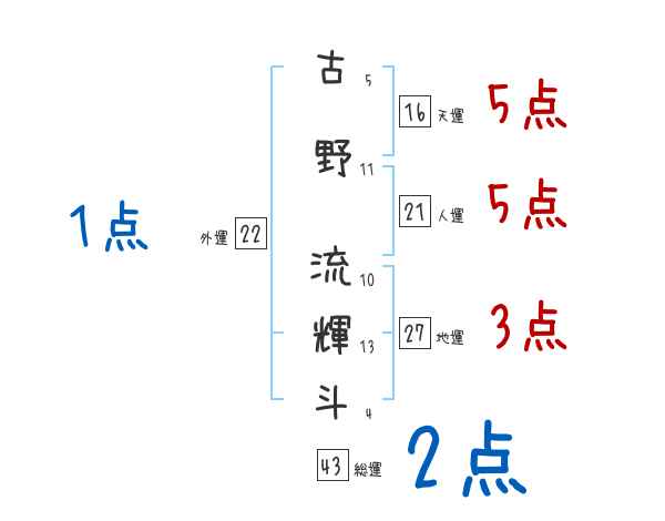 天運![]() | 古野流輝斗さんの天運は16画の5つ星!人望が厚く大きく発展する。逆転成功が見える。 家系が持つ宿命的な運勢を表します。祖先から受け継いだ苗字ですので自分の力が及びません。家柄を象徴します。 |