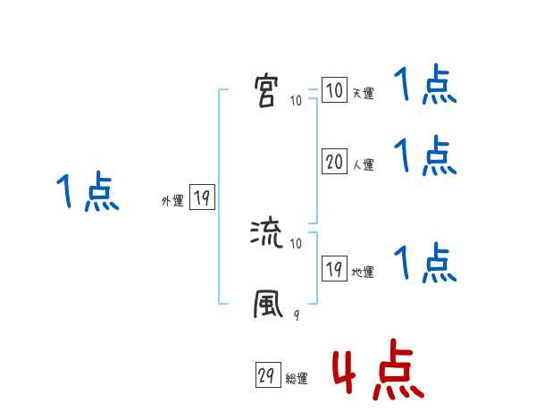 外運![]() | 宮流風さんの外運は19画の1つ星!優れた才能を持ちますが、協調性が足りないことも。周りの人と協力する事を意識しましょう。 生活面を象徴する運勢です。外部から受ける影響力を表し、結婚運、家庭運や職場、環境への順応性を表します。 |