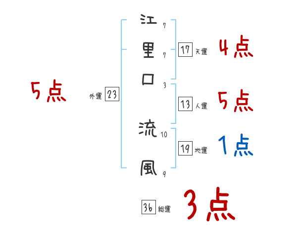 人運![]() | 江里口流風さんの人運は13画の5つ星!才能に恵まれ人気がある。名声を手に入れる。円満な人生。 性格や才能などを表す2番目に重要な運勢です。人間関係や協調性、社会的な成功に影響します。主に20歳から50歳ぐらいまでの中年期の運勢を表します。 |