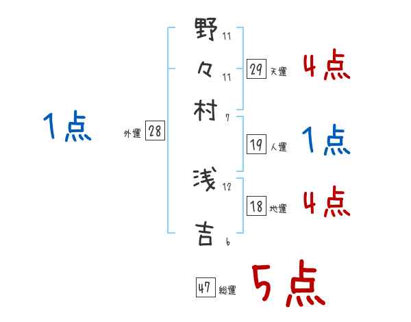 総運![]() | 野々村浅吉さんの総運は47画の5つ星!実力が開花し発展する円満な人生。財に恵まれる。 あなたの人生を表す1番重要な運勢です。生涯を通じて影響する総合運となり、主に50歳以降の晩年期に影響を及ぼします。 |