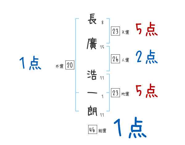 天運![]() | 長廣浩一朗さんの天運は23画の5つ星!想像力に優れ活力がある。一代で成功し名誉を手に入れる。 家系が持つ宿命的な運勢を表します。祖先から受け継いだ苗字ですので自分の力が及びません。家柄を象徴します。 |