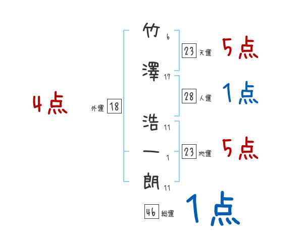 天運![]() | 竹澤浩一朗さんの天運は23画の5つ星!想像力に優れ活力がある。一代で成功し名誉を手に入れる。 家系が持つ宿命的な運勢を表します。祖先から受け継いだ苗字ですので自分の力が及びません。家柄を象徴します。 |