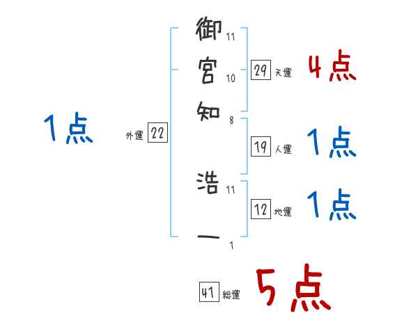 外運![]() | 御宮知浩一さんの外運は22画の1つ星!努力することが苦手ないっぽう手先が器用。芸術性にも優れる。 生活面を象徴する運勢です。外部から受ける影響力を表し、結婚運、家庭運や職場、環境への順応性を表します。 |