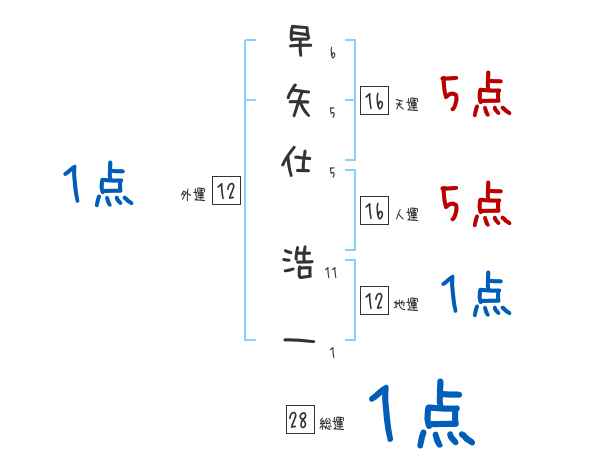 人運![]() | 早矢仕浩一さんの人運は16画の5つ星!人望が厚く大きく発展する。逆転成功が見える。 性格や才能などを表す2番目に重要な運勢です。人間関係や協調性、社会的な成功に影響します。主に20歳から50歳ぐらいまでの中年期の運勢を表します。 |