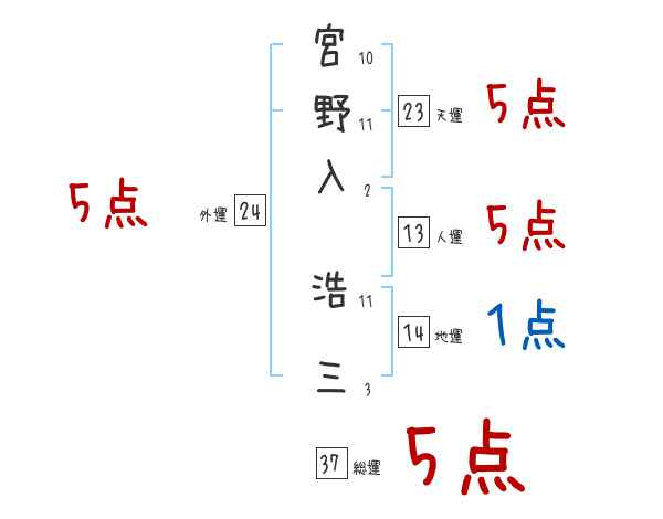 外運![]() | 宮野入浩三さんの外運は24画の5つ星!家庭運が良く順調な人生。金運にも恵まれる。 生活面を象徴する運勢です。外部から受ける影響力を表し、結婚運、家庭運や職場、環境への順応性を表します。 |