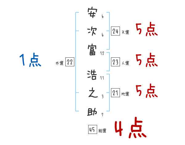 天運![]() | 安次富浩之助さんの天運は24画の5つ星!家庭運が良く順調な人生。金運にも恵まれる。 家系が持つ宿命的な運勢を表します。祖先から受け継いだ苗字ですので自分の力が及びません。家柄を象徴します。 |
