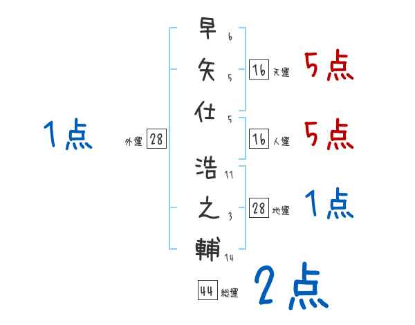 地運![]() | 早矢仕浩之輔さんの地運は28画の1つ星!家庭環境に注意。スポーツで活躍できる能力があるかも。 個性を表す基礎的な運勢です。性格形成や対人関係、行動力など家庭環境に影響されます。主に誕生してから20歳くらいまでの若年期の運勢を表します。 |