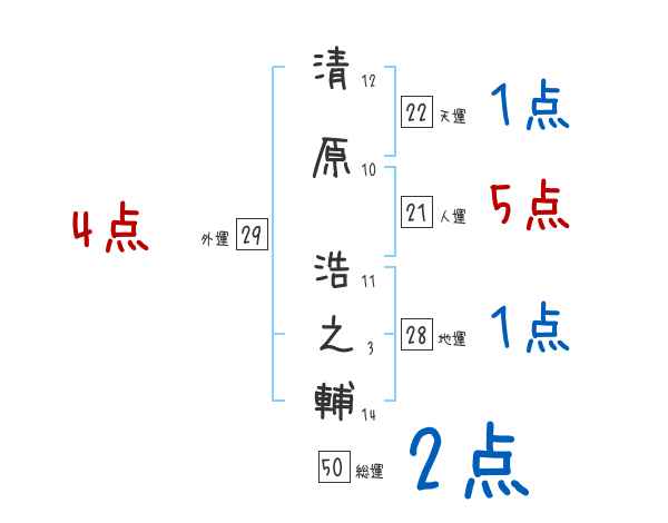 外運![]() | 清原浩之輔さんの外運は29画の4つ星!完全主義で才能がある。厳格な心の持ち主。 生活面を象徴する運勢です。外部から受ける影響力を表し、結婚運、家庭運や職場、環境への順応性を表します。 |