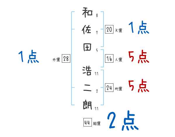 総運![]() | 和佐田浩二朗さんの総運は44画の2つ星!誠実で慎重な性格。物事を考えすぎないように注意しましょう。 あなたの人生を表す1番重要な運勢です。生涯を通じて影響する総合運となり、主に50歳以降の晩年期に影響を及ぼします。 |